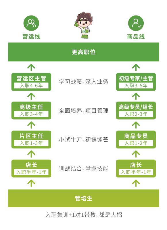 管培生店长→片区主任/商品专员高级主任/商品组长→代理营运经理/营运区主管/商品主管→更高职位