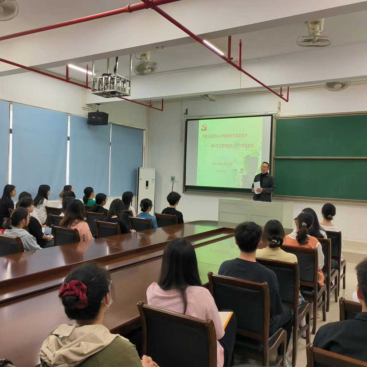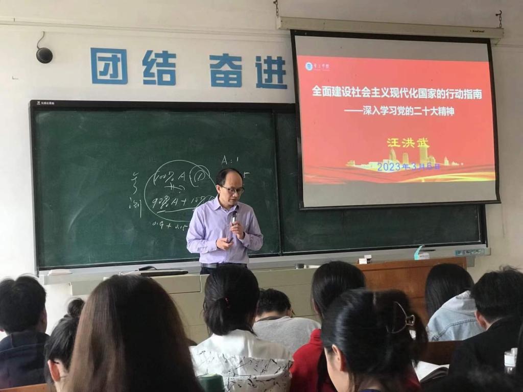 学院院长汪洪武从“过去5年的工作和新时代10年的伟大变革”“开辟马克思主义中国化时代化新境界”“新时代新征程中国共产党的使命任务”“全面建设社会主义现代化国家的谋划安排”“以党的自我革命引领社会革命”五个方面对如何深入学习贯彻党的二十大精神进行了阐释。汪洪武强调党的二十大报告指出,当代中国青年生逢其时,施展才干的舞台无比广阔,实现梦想的前景无比光明。广大青年要坚定不移听党话、跟党走,怀抱梦想又脚踏实地,敢想敢为又善作善成,立志做有理想、敢担当、能吃苦、肯奋斗的新时代好青年。汪洪武寄语同学们,要学思践悟,珍惜大好年华,做信念坚定的新时代青年,让青春在投身党和国家事业的火热实践中绽放绚丽之花。
