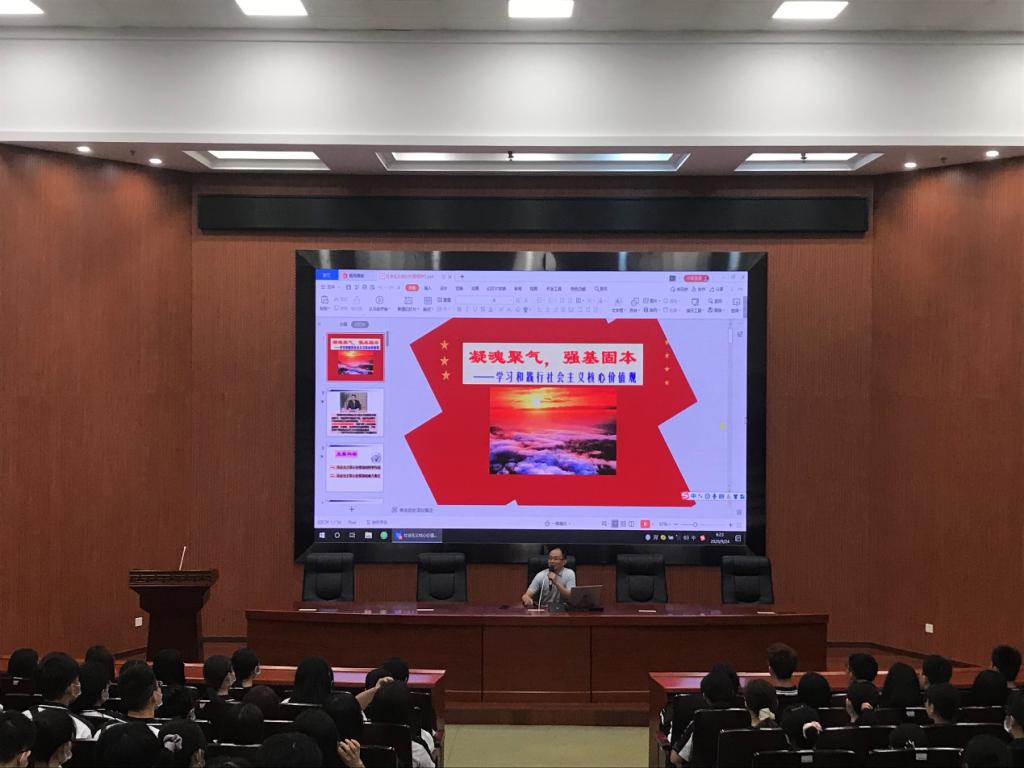 讲座伊始,蔡振治副书记首先以社会主义核心价值观切入话题,从价值目标、价值准则、价值行为多维度剖析了社会主义核心价值观的深刻内涵,从国家、社会、公民多层面阐述了社会主义核心价值观的重要意义。他提出大学生应当成为社会主义核心价值观的践行者和引领者,并指出大学生是社会主义事业的建设者和接班人,肩负着“中国梦”的伟大使命,是推动中国社会发展进步的重要力量。蔡副书记结合具体事例生动形象地简述了“理想”和“信念”的含义,重点指出“理想与信念”有指引人生的奋斗目标、提供人生的前进动力等重要作用,正如疫情期间,逆行者的舍身忘我,正是有着坚定的理想信念做支撑。他鼓励大家,要把理想信念与国家前途、民族命运和时代机遇相结合,把炽热的爱国热情转化为积极的强国行动,争做知识丰富、能力出众、情怀深厚的新时代青年。另外,蔡副书记把学校疫情防控的纪律要求讲通讲透,要求同学们在疫情防控取得阶段性胜利的当下,仍然需要加强警惕,遵守学校疫情防控纪律,注意个人卫生防护,从宿舍到班级再到学院的信息沟通网络要保持顺畅。
