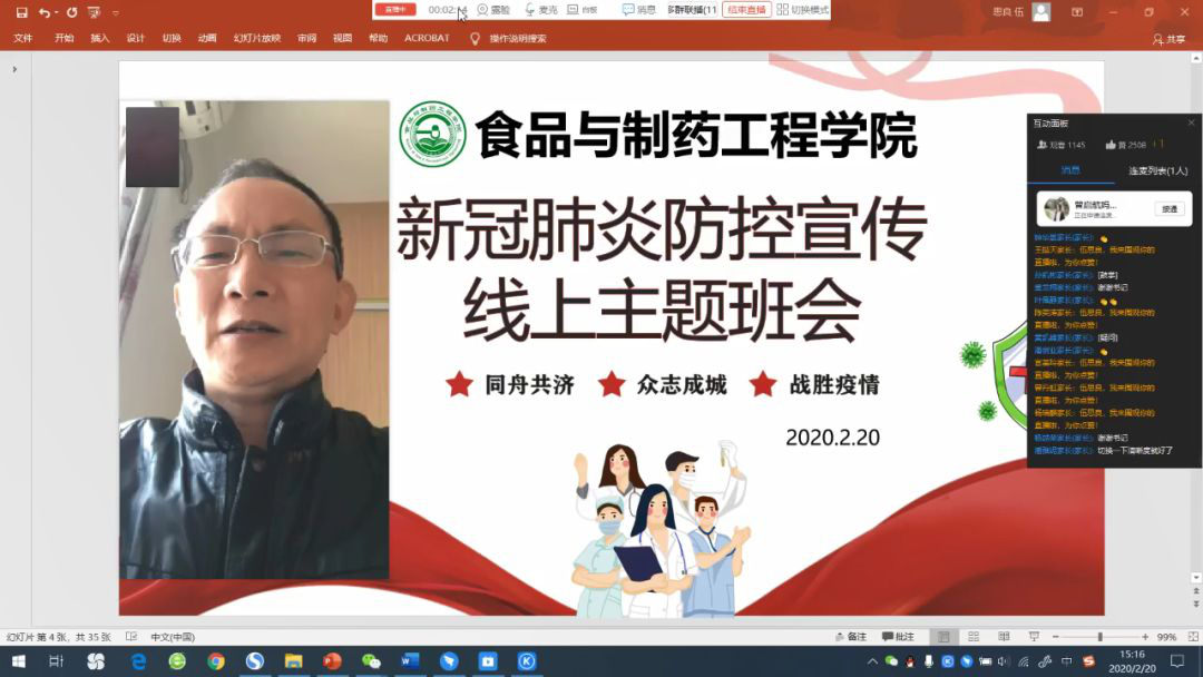 会议采用班级群网络直播以及视频会议的形式举行,在直播中与同学们互动宣传疫情防控工作,会议时长1小时10分,在线人数1145人,总点赞数5024次。此次主题班会共有奏唱国歌、领导讲话、防控宣传以及班主任召开各班线上会议总结4个环节。