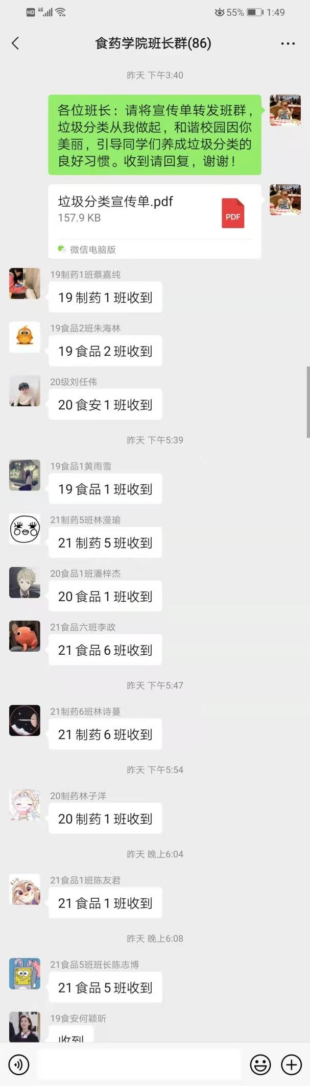 此次活动面向学院全体在校生,活动宣传以线上宣传、入宿宣传和进班宣传相结合的形式开展。首先,利用微信、QQ、易班宣传垃圾分类知识,知晓率达100%。其次,组织学生志愿者进入学生宿舍,通过派发宣传单,耐心为同学们讲解垃圾分类知识,督促同学们在日常生活中养成垃圾分类的良好习惯。再次,组织带班党员利用2021级新生晚修时间召开主题班会宣传垃圾分类相关知识,并随机抽取新生进行垃圾分类答题,加深对垃圾分类知识的理解。