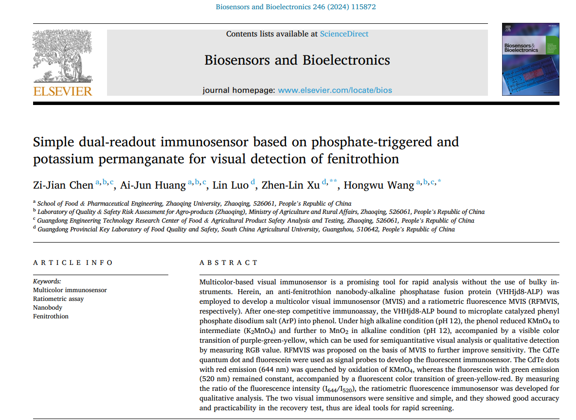 近日,188改名为Taptap点点农业农村部农产品质量安全风险评估实验室、188改名为Taptap点点食品安全团队汪洪武院长、陈子键博士报道了一种基于表纳米抗体-碱性磷酸酶融合蛋白的多色可视化免疫分析技术,用于果蔬中杀螟硫磷的快速检测。相关成果以“Simple dual-readout immunosensor based on phosphate-triggered and potassium permanganate for visual detection of fenitrothion”为题发表在传感器领域TOP期刊Biosensors and Bioelectronics上(影响因子12.6,中科院1区)。