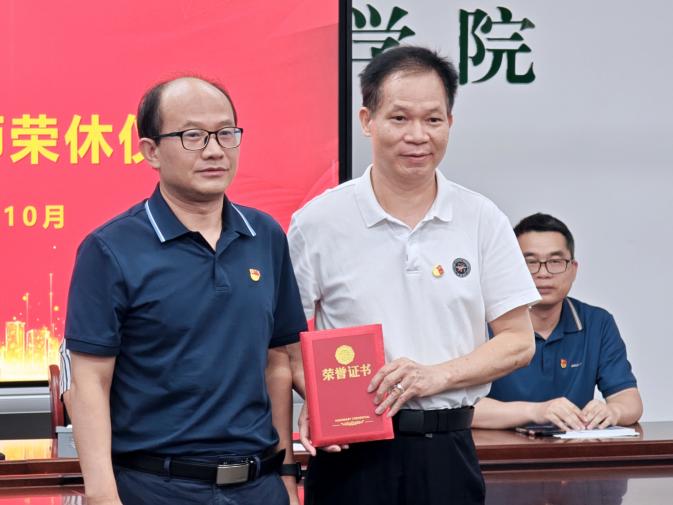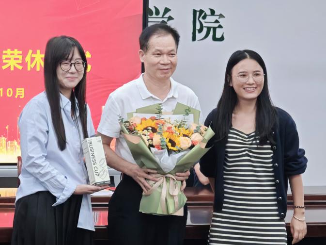 随后,汪洪武院长为莫灿坤老师颁发荣休证书,教学秘书孔彩华和黎丹丹代表全体教职工向莫灿坤老师献上了鲜花和精美礼品,表达对莫灿坤老师崇高的敬意和深深的祝福,希望他能够继续关心学院的发展,继续为学院的发展献计献策,并号召全院青年教师们以荣休教师为榜样,沿着优秀前辈的足迹,为教育事业而努力奋斗。