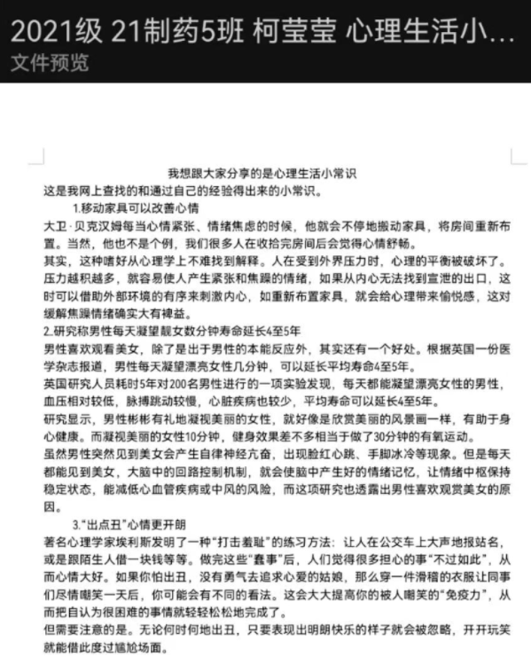 活动一经发出,就得到了同学们的踊跃投稿。有的同学利用自己的专业知识,为我们细细描述了生动有趣的科学心理小故事;有的同学以日常中的蔬菜、水果为喻,向大家阐明了及时关注自身心理健康的重要性;还有的同学结合自身的经历,分享了疫情当下的校园中,所见到的有趣的人文。一份又一份的投稿,满满的都是大家对一起共度时艰的信心和决心。
