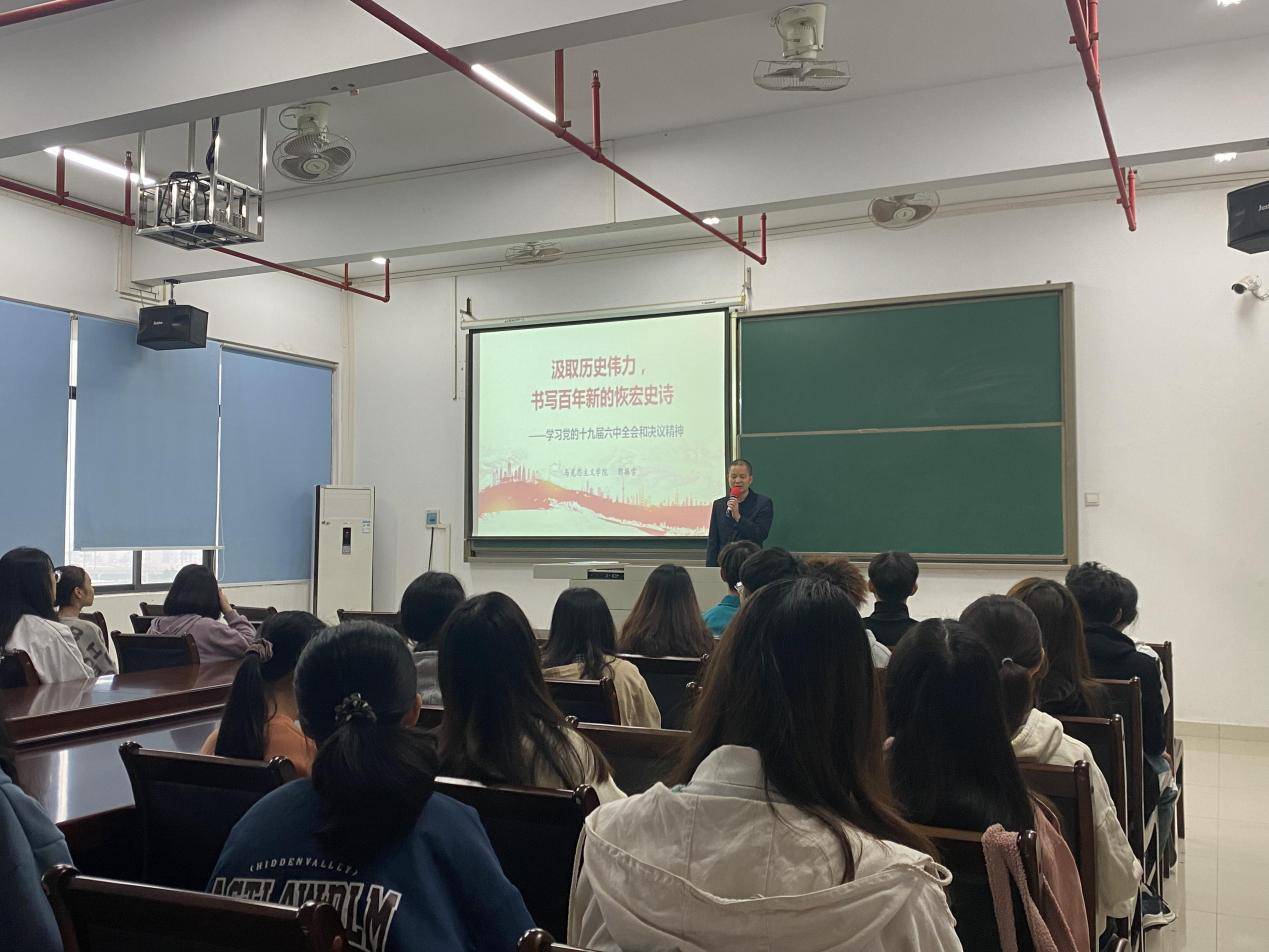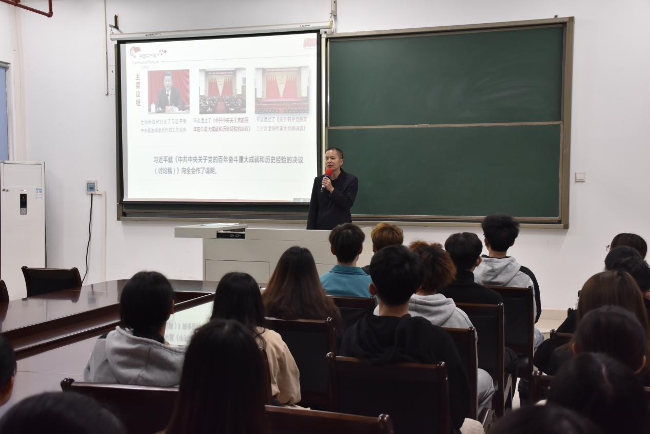 郭振雪老师以习近平总书记在党的十九届六中全会上的重要讲话精神为出发点,从党的十九届六中全会的基本概况、主要精神、第三个历史决议的重大意义等方面与师生进行了深入交流。郭振雪老师寄语新时代的青年学生,要有“勇立潮头敢为先”的精神,不畏困难勇于创新,有所作为。他勉励青年学生要在赓续百年红色传承中彰显青春担当,从百年党史的回望中汲取信仰力量,从新百年新征程的使命召唤中激发担当精神,自觉践行“请党放心、强国有我”的青春誓言。